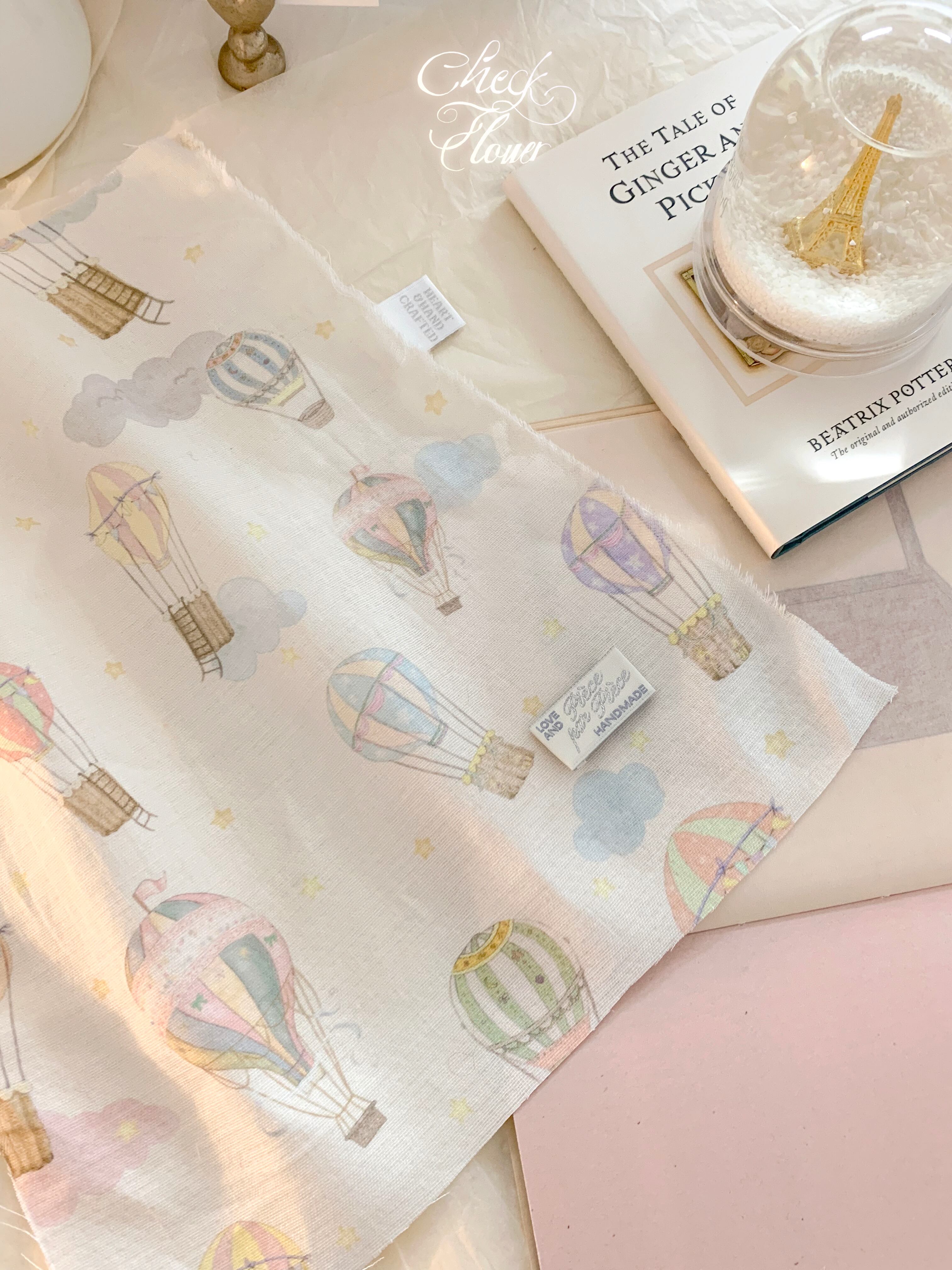 手描きとは思えないほど鮮明に描かれている気球デザイン check and flowerだからできるこのクオリティ♡ 素材 :コットン100%、ダブルガーゼ カラー:アイボリー・ピンク・ブルー 生地幅:145cm サイズ:気球サイズ約6cm 注文数:数量1=0.5y=45cm 原産国:韓国