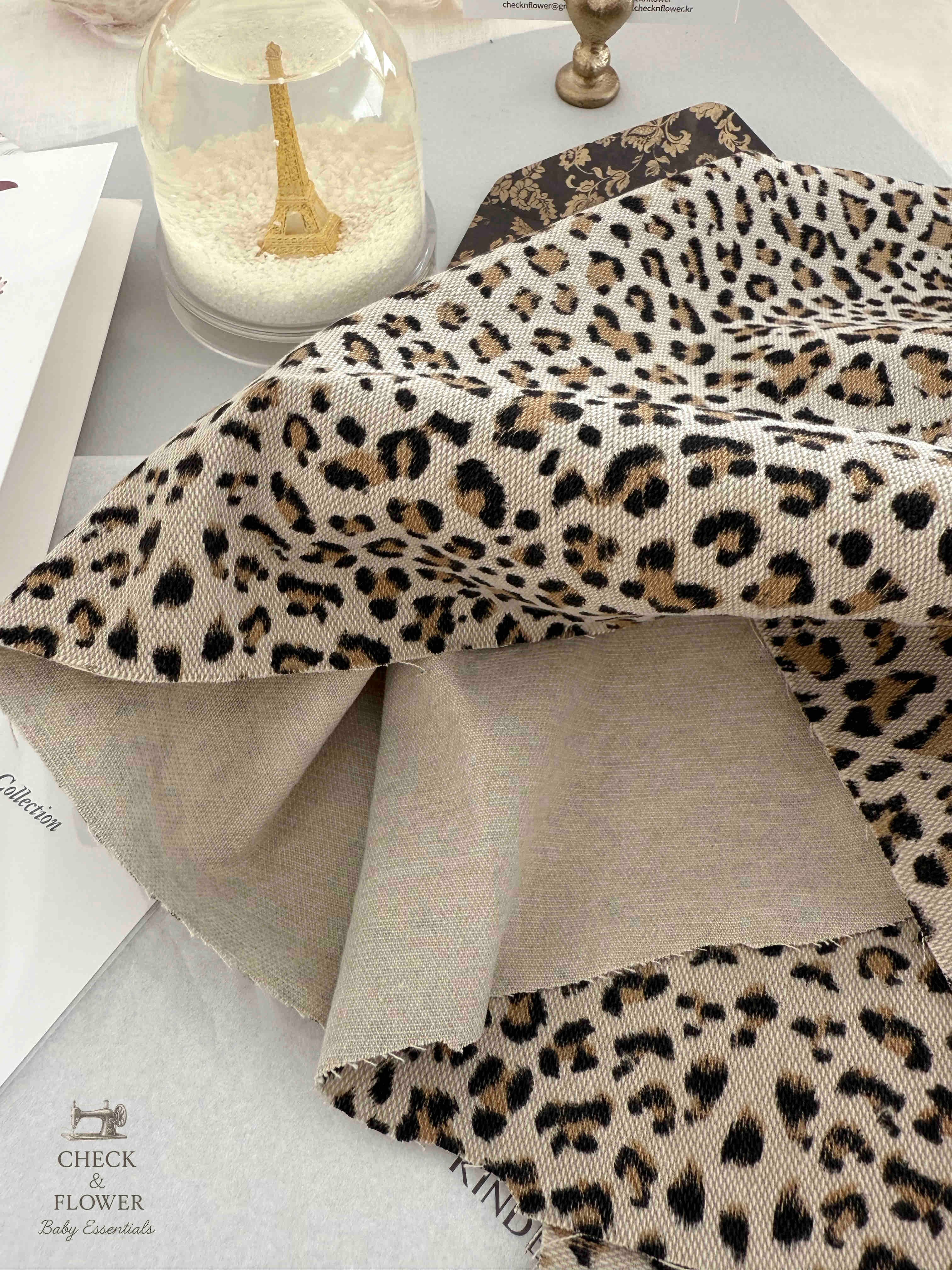 ナチュラルベージュトーンの上にクラシックなヒョウ柄パターンで落ち着いた高級なムード。