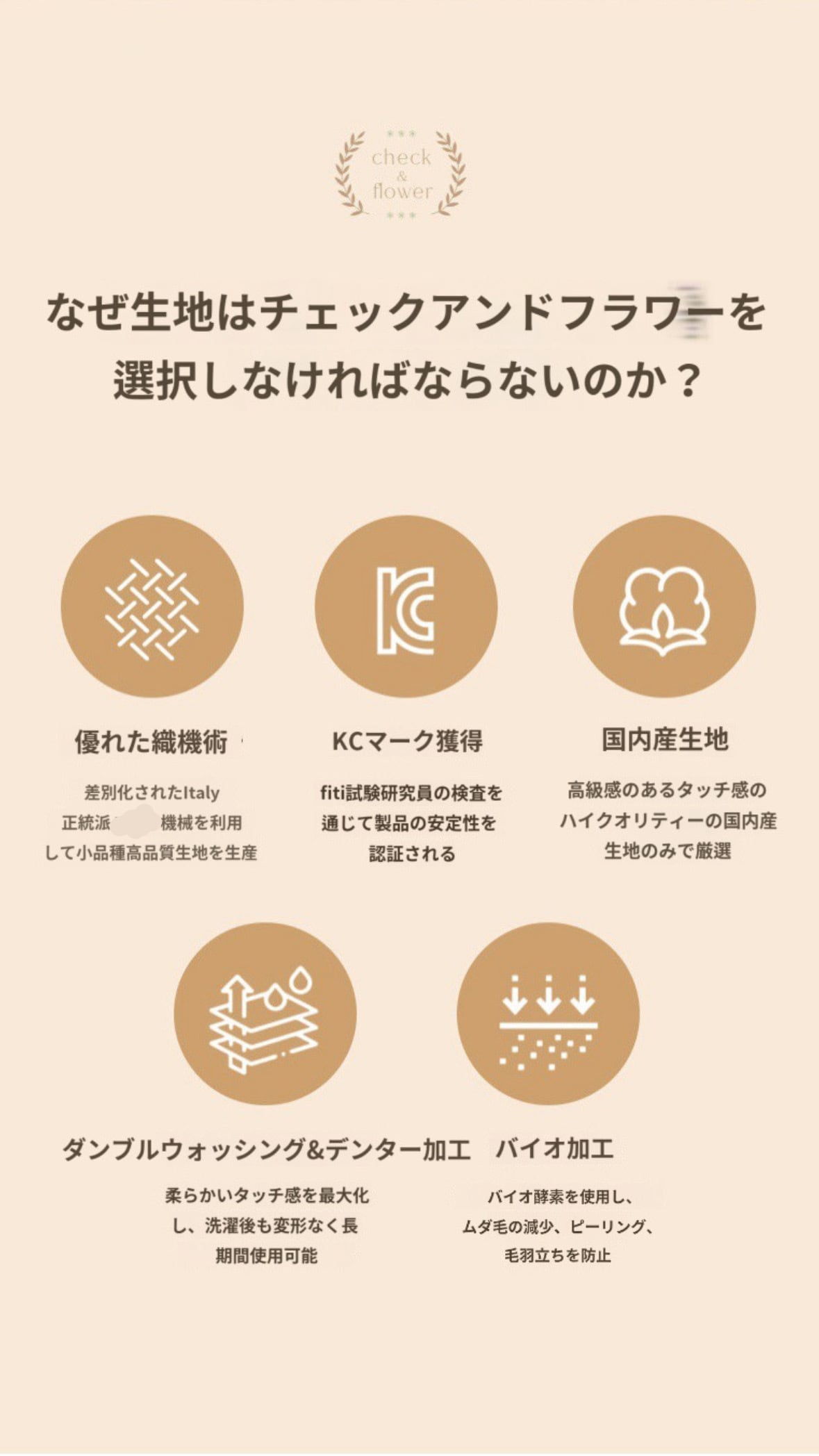 例:"チェックアンドフラワーニ重ガーゼの生地で製作した〇〇です。”←消費者 信頼度および購買転換率の向上に役立ちます。