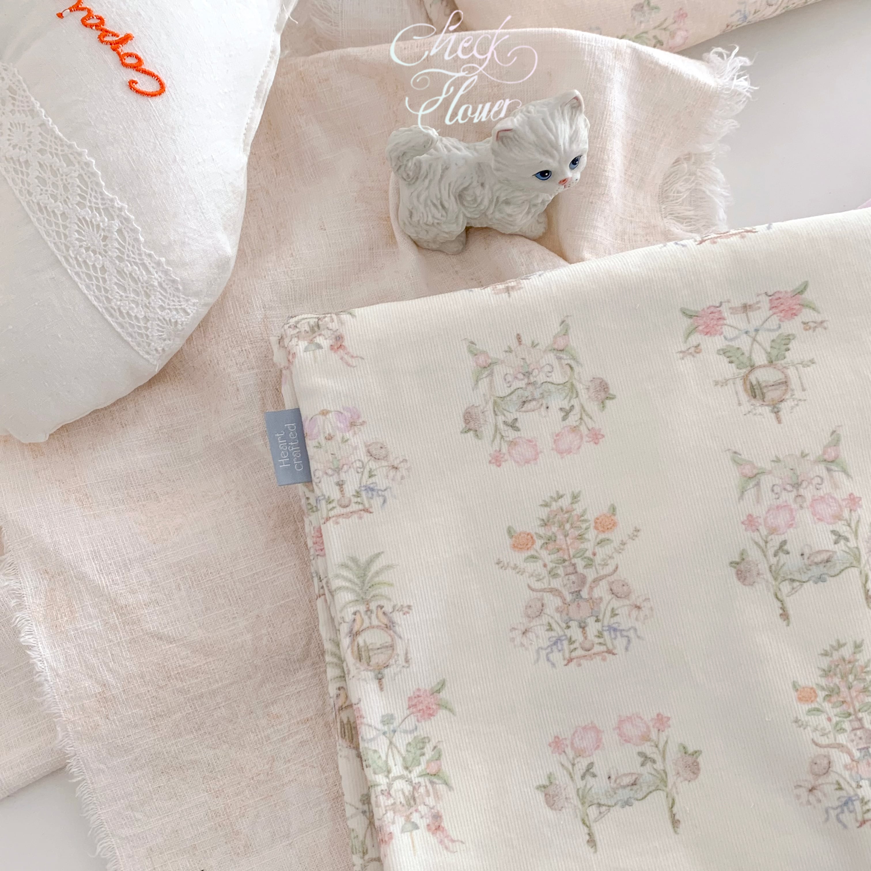 素材 :コットン100%、コーデュロイ生地 カラー:アイボリー・ベージュ・ラベンダー 生地幅:150cm サイズ:モチーフ縦サイズ6cm 注文数:数量1=0.5y=45cm 原産国:韓国
